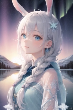 (original, (masterpiece), (illustration:1.1), (detailed and beautiful), (perfect details), (unity CG 8K wallpaper:1.05), (beautiful and clear background:1.25), (depth of field:0.75), (1 (cute young girl:0.9) with long silver hair, ((snowflake:0.4) head ornament on hair:1.1) and (rabbit ears:1.1) stands aside the (frozen lake with (forest and mountain:1.1):1.35) under the (sunset:1.2) in the (winter:0.65):1.1). (detailed beautiful eyes:1.2), (beautiful face:1.2), (hair blowing with the wind:1.05), (blue eye:1.1), solo, (snow:0.4), aurora, stars.)