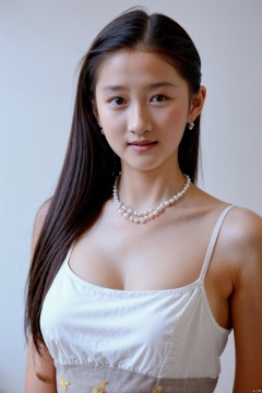 (masterpiece, 4k, best quality, highly detailed, 1girl, solo),1girl, jewelry, breasts, solo, earring, black hair, cleavage,Silk camisole pajamas, necklace, looking at viewer, Camisole pajamas, long hair,upper body, parted lips, rose, bangs, collarbone, grey background, big breasts, black eyes, pearl necklace, large breasts, see-through, hair between eyes, brown eyes, blush, midjourney, Colorful portraits, jiejing, xiaofei, xueli, tongtong