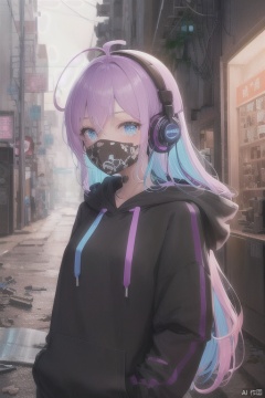 (detailed 8k wallpaper,In a dilapidated alley,girl focus,A girl,multicolored hoodie,mouth mask,ahoge,crystal pink_hair,glowing eyes,blue_eyes,cyberpunk,Sci-fi city, kowloon,detailed background,intricate detail,finely detailed,highres,Red light,Blue light,Purple light,behind-the-head headphones,)