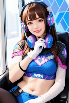 1 girl, solo, long hair, breasts, looking at the audience, smile, bangs, brown hair, gloves, brown eyes, medium breasts, upper body, parted lips, one eye open, indoor, white gloves, windows, tights, navel, headphones, facial markers, skin tightness, index finger lift, pilot suit, beard markers, shoulder pads, blue tights, ribbed tights, d.va\ (surveillance\)