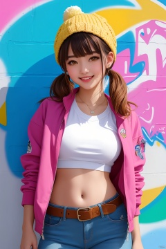 best quality,high resolution,distinct image,best quality,high resolution,distinct image,Original Characters,Natural Volumetric Lighting And Best Shadows,Deep Depth Of Field,Sharp Focus,Portrait Of Stunningly Beautiful Petite Girl,Soft Delicate Beautiful Attractive Face With Alluring Yellow Eyes,Lovely Small Breasts,Sharp Eyeliner,Seductive Smiling,Open Mouth With Cute Fangs Out,Windswept Disheveled Brown Hair,Thick Layered Medium Twintail Hairstyles,Blush Eyeshadow With Thick Eyelashes,Parted Lips,Applejack Hat,Oversized Pop-Art Jacket,Slim Waist With Open Cute Navel,Denim Jeans Pants With Buckle Belt,(Messy Painted Body:1.05),(Holding Spray Paint Can:1.1),(Graffiti Murals Wall Background:1.15),(Standing On Narrow City Streets Crossword:1.2),(Highest Quality, Amazing Details:1.4),Masterpiece,Bloom,Picturesque,Brilliant Colorful Paintings,masterpiece,Hd,