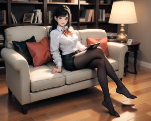 (best quality), ((masterpiece)), (highres), illustration, original, extremely detailed,1girl, book, pantyhose, long hair, shirt, no shoes, crossed legs, sitting, cat, plant, brown eyes, solo, underwear, indoors, bow, bookshelf, potted plant, bra, breasts, bowtie, white shirt, looking at viewer, black hair, black pantyhose, chair, smile, wooden floor, dress shirt, no pants, thighband pantyhose, armchair, lamp, long sleeves, sparkle, black bra, collared shirt, cleavage, bangs, medium breasts, full body, couch, open book