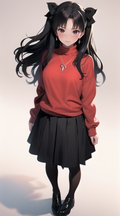 (best quality), ((masterpiece)), (highres), illustration, original, extremely detailed,1girl, solo, tohsaka rin, long hair, skirt, pantyhose, jewelry, long sleeves, black skirt, full body, breasts, black hair, white background, two side up, red sweater, earrings, hair bow, looking at viewer, pleated skirt, black footwear, blush, bow, simple background, sweater, bangs, shoes, closed mouth, black pantyhose, red shirt, medium breasts, standing, necklace