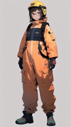 (best quality), ((masterpiece)), (highres), illustration, original, extremely detailed,ooo, 1girl, solo, gloves, white background, full body, simple background, brown eyes, standing, helmet, brown hair, glasses, looking at viewer, closed mouth, short hair