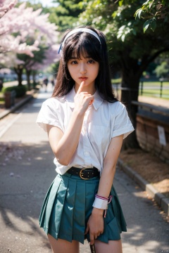konpaku_youmu, petals, sword, weapon, cherry_blossoms, 1girl, solo, katana, green_skirt, ribbon, sheath, hairband, black_hairband, hair_ribbon, holding_sword, skirt, black_ribbon, silver_hair, belt, short_sleeves, flower, hitodama, holding, shirt, konpaku_youmu_ghost,