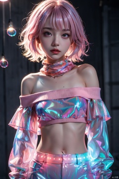 bubble,pink hair,High quality, masterpiece, Portrait,cinematic texture,1girl,sexy_sweater, navel,Scarf,Off shoulder, hologram girl
