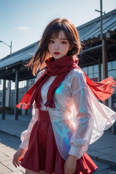 1girl, red dress, (scarf), wind, petal, 1 girl, purdress, Sky Fantasy, Light master, (\meng ze\), hologram girl