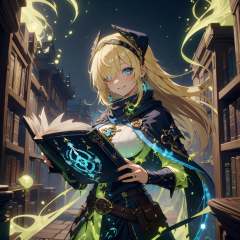 <lora:AcidMagic-22:0.9>,AcidMagic , fantasy, toxic corrosion , acid aura,curvy, big breasts, blue eyes, blonde hair, long hair, blunt bangs, hair over one eye, headband, kind smile, earnest, cape, circlet, bohemian dress , scarf, belt,1girl, holding a AcidMagic book, eerie dark magical library ,