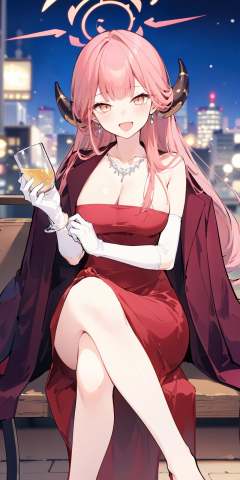(masterpiece:1.2),best quality,PIXIV,Aru (red dress),1girl, long hair, solo, horns, aru \(blue archive\), gloves, dress, breasts, sitting, pink hair, holding, jacket on shoulders, smile, open mouth, necklace, white gloves, bangs, jewelry, looking at viewer, :d, blush, halo, cleavage, crossed legs, coat on shoulders, jacket, cup, holding cup, night, red dress, collarbone, feet out of frame, elbow gloves, large breasts, drink, blunt bangs, blurry, cityscape, drinking glass<lora:Aru red dress_20240224115337:0.8>,