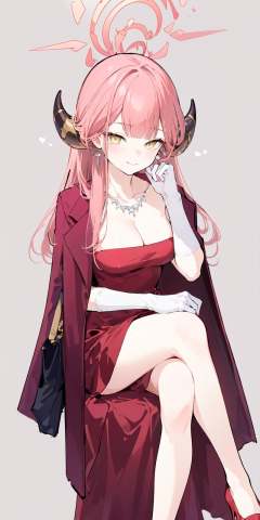 (masterpiece:1.2),best quality,PIXIV,Aru (red dress),1girl,gloves,solo,aru \(blue archive\),horns,long hair,white gloves,dress,breasts,halo,necklace,red dress,looking at viewer,jewelry,cleavage,handbag,pink hair,simple background,smile,coat on shoulders,bangs,jacket on shoulders,bag,sitting,crossed legs,high heels,jacket,elbow gloves,closed mouth,grey background,yellow eyes,red footwear,strapless,collarbone,medium breasts,hand on own chin,<lora:Aru red dress_20240224115337:0.8>,