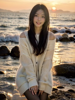 (1girl, young beauty), sitting, smile, looking at viewer, from above, sharp focus, oversized_sweater, shoulder,
