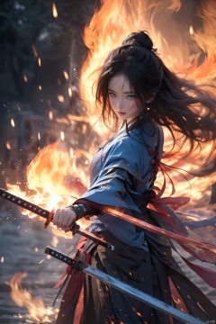 (masterpiece, best quality:1.2),1girl,black hair,blue eyes,blurry background,burning,depth of field,fire,flame,flaming sword,flaming weapon,Unsheathed sword,solo,Grasp the hilt with your hand,Blue flames,Hanfu,Brave and spirited,sword-dance,holding sword,long hair,magic,night,solo,water
