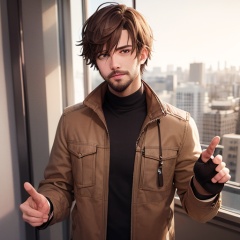 (day),high rise apartment, windows,brown jacket,fingerless gloves, jacket, long sleeves,beard,facial hair, forehead,brown hair,green eyes,Bangs,Short hair,1 Man, 40yo,male,looking at viewer,NSFW,official art,extremely detailed CG unity 8k wallpaper, perfect lighting,Colorful, Bright_Front_face_Lighting,(masterpiece:1.0),(best_quality:1.0), ultra high res,4K,ultra-detailed,photography, 8K, HDR, highres, absurdres:1.2, Kodak portra 400, film grain, blurry background, bokeh:1.2, lens flare, (vibrant_color:1.2)