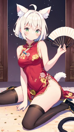 1girl, solo, animal ears, dress, chinese clothes, thighhighs, green eyes, red dress, china dress, tail, cat ears, breasts, extra ears, sitting, see-through, holding, cat tail, short hair, wariza, hand fan, white thighhighs, looking at viewer, black footwear, folding fan, ahoge, no panties, sleeveless, sleeveless dress, white hair, red nails, animal ear fluff, thighs, covered navel, detached sleeves, holding fan, blush, full body, nail polish, cat girl, medium breasts, closed mouth, floral print, hair intakes, bare shoulders, bangs