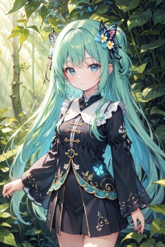 1 girl, surrounded by big leaf plants, wearing flower accessories, (Old-growth forest), (long hair) puberty, young girl, bright outline,Butterfly Dance,surrealistic,tuyawang, senlin