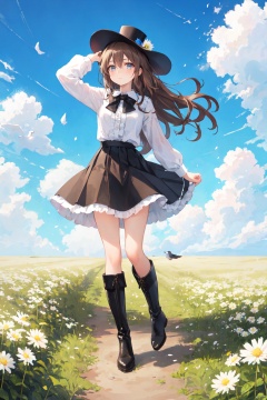 1girl, bangs, bird, black_footwear, black_headwear, blue_flower, blue_sky, blush, boots, bouquet, bow, brown_eyes, brown_hair, cloud, cloudy_sky, daisy, dandelion, day, dove, eyebrows_visible_through_hair, field, flower, flower_field, frills, full_body, hair_between_eyes, hat, holding_flower, knee_boots, leaf, leaves_in_wind, lily_\(flower\), long_hair, long_sleeves, looking_at_viewer, mini_hat, mini_top_hat, petals, shirt, skirt, sky, solo, standing, top_hat, very_long_hair, white_flower, white_rose, white_shirt, yellow_flower