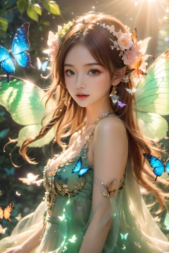 1 girl, crystal dress, crystal headdress, crystal necklace, crystal earrings, butterflies on her head, tentacles, fuzzy background, brown hair, butterflies, butterfly hair accessories, butterflies in her hands, butterfly wings, cleavage, fairies, fairy wings, flowers, flying, glowing butterflies, glowing wings, green wings, hair accessories, ice wings, lips, long hair, etc.