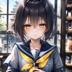 delicate face,kawaii,cute face,1girl, solo, looking at viewer, bangs, shirt, long sleeves, holding, hair between eyes, brown eyes, school uniform, blue hair, collarbone, yellow eyes, white shirt, upper body, ponytail, parted lips, serafuku, indoors, sailor collar, neckerchief, book, window, blue sailor collar, holding book, open book, bookshelf, black neckerchief, library,delicate face, kawaii, The highest picture quality, highest quality, and highest clarityThe highest picture quality, highest quality, and highest clarity,face close-up,<lora:EMS-302507-EMS:0.400000>,<lora:EMS-303221-EMS:0.100000>,<lora:EMS-304051-EMS:0.800000>