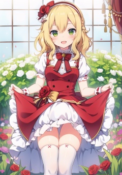 (best quality), ((masterpiece)), (highres), illustration, original, extremely detailed wallpaper.  <lora:cutegirl-000008:0.7>1girl, sakurai momoka, solo, blonde hair, green eyes, smile, thighhighs, open mouth, dress, petals, white thighhighs, looking at viewer, short hair, blush, flower, hairband, hair ornament, braid, hair flower, :d