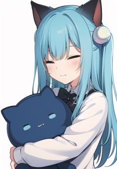 (best quality), ((masterpiece)), (highres), illustration, original, extremely detailed wallpaper.  <lora:cutegirl-000008:0.7>1girl, stuffed toy, animal ears, solo, long sleeves, bow, closed eyes, white shirt, white background, cat ears, stuffed animal, long hair, stuffed cat, sleeves past wrists, black bow, closed mouth, facing viewer, smile, shirt, simple background, blue hair, fang, ^_^, upper body, bangs, object hug, blush, hair ornament, fang out, one side up, holding stuffed toy, puffy sleeves, puffy long sleeves, holding, hair bobbles