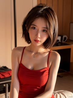 1, 1girl, short hair, brown hair, solo, dress, brown eyes, looking at viewer, holding, red dress, parted lips, bare shoulders, indoors, lips, upper body, sleeveless