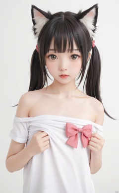 masterpiece,best quality,very long hair,cowboy shot,4349,animal_ears,1girl,twintails,simple_background,shirt_pull,white_background,long_hair,solo_focus,black_hair,cat_ears,looking_at_viewer,blush,parted_lips,bangs,loli,animal_ear_fluff,flat_chest,clothes_pull,bow,pink_bow,shirt,upper_body,hair_bow,bare_shoulders,off_shoulder,white_shirt,