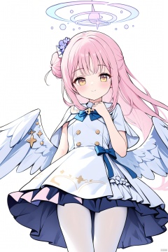 1girl,(masterpiece:1.3),( beautiful:1.2),(high quality:1.2),(finely detailed:1.2),extremely detailed CG unity 8k wallpaper,best quality,a very delicate and beautiful,perfect fingers,(one cute girl at the center:1.2),simple_background,white background,halo,  mikaBA,long hair,breasts,bangs,hair ornament,dress,bow,closed mouth,yellow eyes,pink hair,flower,pantyhose,wings,hair flower,bowtie,hair bun,white dress,blurry,halo,blue bow,feathered wings,white pantyhose,angel wings,white wings,single side bun,low wings,wrist scrunchie,white capelet,mika \(blue archive\)