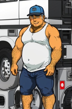 1man, Kamura, plump, male focus, belly, 1boy, bara, muscular male, pants, **** top, white **** top, solo, muscular, leg hair, old, pectorals,clothing aside, chest hair,abs, stomach, arm_hair, feet_out_of_frame, short_hair, washing_machine, eg_hair, car, white_****_top, hat, recording, ****_top, goatee, bulge, dark_skin, <lora:SD1.5_KAMURA.V1:0.8>