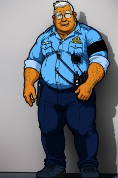 1man, Kamura, 1boy, solo, male focus, uniform, police uniform, glasses, police, muscular, fat, old, old man, sleeves rolled up, muscular male, full body, bara, white hair, plump, shirt, walkie-talkie, weapon, open mouth, pectorals, fat man, dark skin, pants, shadow, facial hair, short hair a cartoon character is standing in front of a wall with a camera in his hand and a police uniform on, police, police_uniform, glasses, 1boy, dark_skin, solo, uniform, old, <lora:SD1.5_KAMURA.V1:0.8>
