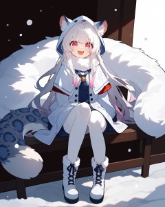 (score_9,score_8_up,score_7_up,score_6_up,score_5_up,score_4_up),solo blue shirt,blue sailor coat,full body,white hair,snow leopard ear,white background,white hood,pink eyes,white cloak,fur-trimmed snow leopard ear capelet,laugh,happy,white pantylines,fur-trimmed boots,red armband,