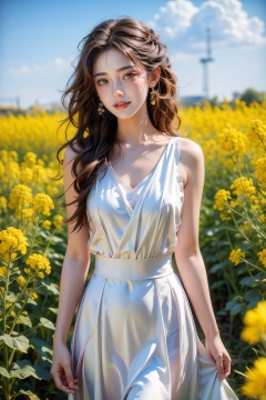 A beautiful woman standing in a blooming rapeseed field, wearing a white top and a red skirt, the skirt fluttering gently. Surrounded by golden rapeseed flowers, with gently rolling hills in the distance, the sky is a deep blue with a few white clouds leisurely drifting by. High-definition photo of the most beautiful artwork in the world featuring a lady in white and red dress standing in a sea of golden rapeseed flowers, smiling, freckles, white outfit, red skirt, nostalgia, sexy, dramatic oil painting by Ed Blinkey, Atey Ghailan, Studio Ghibli, by Jeremy Mann, Greg Manchess, Antonio Moro, trending on ArtStation, trending on CGSociety, Intricate, High Detail, Sharp focus, photorealistic painting art by midjourney and greg rutkowski., Light master,<lora:EMS-302987-EMS:0.600000>,<lora:EMS-260325-EMS:0.200000>,<lora:EMS-57039-EMS:0.200000>,<lora:EMS-276654-EMS:0.200000>,<lora:EMS-93-EMS:0.500000>