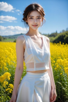 A beautiful woman standing in a blooming rapeseed field, wearing a white top and a red skirt, the skirt fluttering gently. Surrounded by golden rapeseed flowers, with gently rolling hills in the distance, the sky is a deep blue with a few white clouds leisurely drifting by. High-definition photo of the most beautiful artwork in the world featuring a lady in white and red dress standing in a sea of golden rapeseed flowers, smiling, freckles, white outfit, red skirt, nostalgia, sexy, dramatic oil painting by Ed Blinkey, Atey Ghailan, Studio Ghibli, by Jeremy Mann, Greg Manchess, Antonio Moro, trending on ArtStation, trending on CGSociety, Intricate, High Detail, Sharp focus, photorealistic painting art by midjourney and greg rutkowski.,<lora:EMS-260325-EMS:0.200000>,<lora:EMS-57039-EMS:0.200000>,<lora:EMS-302987-EMS:0.600000>