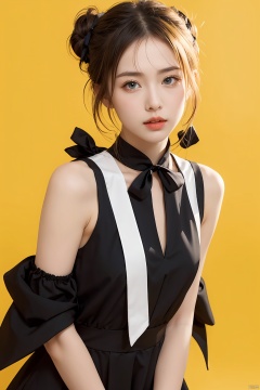 masterpiece,1girl,solo,looking at viewer,bangs,blonde hair,simple background,dress,ribbon,bare shoulders,hair ribbon,yellow eyes,braid,sidelocks,small breasts,black gloves,elbow gloves,hair bun,black ribbon,sleeveless dress,single hair bun,yellow background,french braid,lolita fashion,black border,artoria pendragon \(fate\),saber,, artoria pendragon \(fate\), caiyi, qianrenxue, yunqing,blue eyes