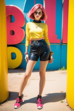 A fashionable young girl taking photos in the sunny weather, wearing trendy clothes, with a background of Memphis-style photography elements, featuring bright colors and artistic vibes. High-definition photo of a trendy girl in vibrant Memphis-style setting under the sun, full of lively colors and youthful energy.