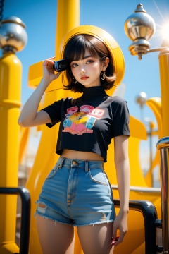 A fashionable young girl taking photos in the sunny weather, wearing trendy clothes, with a background of Memphis-style photography elements, featuring bright colors and artistic vibes. High-definition photo of a trendy girl in vibrant Memphis-style setting under the sun, full of lively colors and youthful energy., (\meng ze\)