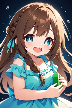 1girl, :d, braid, brown_hair, collarbone, crying, crying_with_eyes_open, dress, frills, green_eyes, holding, long_hair, looking_at_viewer, open_mouth, parted_bangs, smile, solo, tears, teeth, upper_teeth