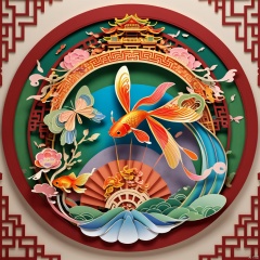 3D-big-circle-lantern on fire lighting , , formed by complex details paper art  , in the pattern of  betterfly in center and surrounding by 2-long-tails-goldfish,  red, blue, pink ,gold , green , orange, rainbow colour  chinese style , shining and monogram,  full of patterns covered , art ,
