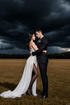 👫,a Handsome man and a sexy woman hugging together,standing in a field,Asian,exquisite facial features,(muscular man wearing formal suit,footwear), (slim woman wearing white Chiffon dress,the skirt sways with the wind,black pantyhose), face to face, affectionate, charming eyes, on the eve of the storm, dark clouds, cumulonimbus, solitary and mysterious atmosphere, graceful yet melancholic posture, Volumetric lighting,full shot,Ultra High Resolution,profession,High-end fashion photoshoot,(masterpiece, realistic, best quality, highly detailed),jzns,plns, ((poakl))