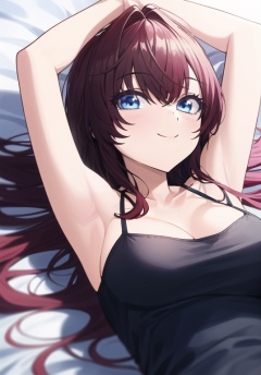(best quality), ((masterpiece)), (highres), illustration, original, extremely detailed  <lora:モだれの画布:0.6>msds, 1girl, solo, ichinose shiki, breasts, long hair, armpits, looking at viewer, lying, on back, arms up, smile, blue eyes, upper body, cleavage, bangs, collarbone, closed mouth