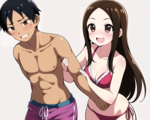 (best quality), ((masterpiece)), (highres), illustration, original, extremely detailed,  <lora:yongyiduoren:0.8>yyds, 1girl, swimsuit, bikini, 1boy, brown hair, brown eyes, blush, navel, takagi-san, pink bikini, long hair, smile, bangs, arm hug, frills, frilled bikini, bare shoulders, collarbone, side-tie bikini bottom, red bikini, forehead, grin, parted bangs, bare arms, male swimwear, open mouth, swim trunks, white background, nose blush, black hair, simple background, teeth