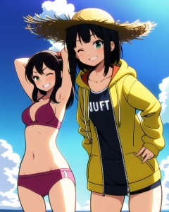 (best quality), ((masterpiece)), (highres), illustration, original, extremely detailed,  <lora:yongyiduoren:0.8>yyds, toshinou kyouko, funami yui, multiple girls, 2girls, swimsuit, bikini, beachball, blonde hair, hat, ball, smile, closed eyes, black hair, navel, long hair, grin, day, hoodie, hood, outdoors, short hair, hair bow, beach, open hoodie, green eyes, bow, straw hat, cloud, arms up, sky, jacket