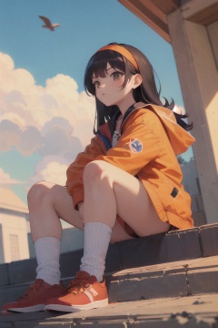 (masterpiece, best quality, ultra detailed), 1girl,orange shoes,solo,sitting,sky,clouds,outdoors,black hair,bird,upward view,blue sky,white socks,daytime,orange jacket,building,long sleeves,leaves,long hair,stairs,red headband,pump Rope,headband,bangs,cloudy sky,from_below,wide_shot,