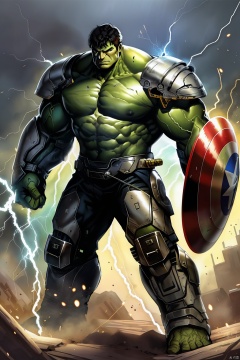 solo, 1boy, male focus, armor, muscular, colored skin, abs, science fiction, shield, electricity, giant, green skin, damaged, power armor