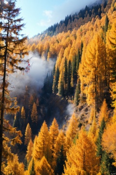Forests, paths, tall trees, giant trees, morning mist, golden autumn