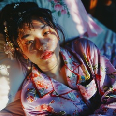 guaiguailuli girl, ell4jo,pajama pants.oversized shirt,on bed,view from above, style by Dan Winters,RAW photography,film grain,(indistinguishable from reality:1.4),photo taken with a Bolex H16, Thorough,analog style,female focus,highest quality,(highly detailed skin),perfect face,skin pores,(bokeh:0.6),sharp focus,dappled lighting,(backlighting:0.7),film grain,photographed on a Sony A7R IV,18mm F/1.7 cine lens,(highly detailed, intricately detailed),8k,HDR,front view,(full body visible:1.2), <lora:poaklggllgirl-000007:0.8>