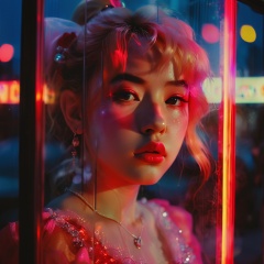 guaiguailuli girl, cinematic film still, cute princess peach standing behind a glass. Neon lights, possibly from a cityscape or urban setting, are superimposed on the image, casting a red hue and adding to the ambiance. The background is blurred but suggests an urban environment with reflections and lights. moody and atmospheric tone. The individual's face is partially obscured by what appears to be a smoky or misty effect. princess peach is sad, head slightly tilted. In Casey Baugh's evocative style, <lora:poaklggllgirl-000007:0.8>