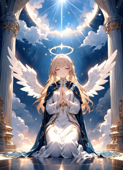 painting of a woman wearing shabby cape kneeling on the ground praying to the sky for peace.looking down. (praying:1.5).the sky is cloudy but with some sunlight rays through the clouds, light particles surrounded the woman. delicate face, pretty face, masterpiece, highres, delicate details, angel wings in the sky.celestial, ethereal, painterly, epic, magical, fantasy art, dreamy, vibrant, beautiful, detailed, textural,holy lighting, halo,Pillar of light