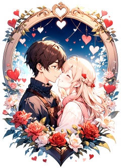 An illustration depicting a sweet Valentine's Day moment between a boy and a girl. The boy and girl are shown enjoying a romantic and memorable Valentine's Day together. They are portrayed in a charming and heartwarming style, with smiles on their faces and a joyful aura surrounding them. The scene is filled with symbols of love and affection, such as hearts, flowers, and chocolates. The color palette chosen for this image is soft and warm, reflecting the tender emotions of the couple. The overall result is a delightful portrayal of a boy and girl celebrating a sweet Valentine's Day, beautifully rendered in a style that captures the essence of love and happiness.