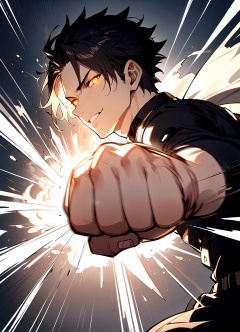 1man,male focus,solo,looking at viewer,punching,motion lines,holding_breath,motion blur,clenched hand,glowing_eyes,black body,steam,steam,light_smile,,cool,first-persion view,from side,glowing,punch on foreground,pov_punching,