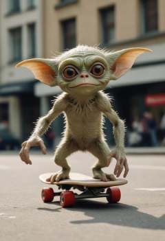 Leica portrait of a gremlin skateboarding, coded patterns, sparse and simple, uhd image, urbancore, sovietwave, period snapshot